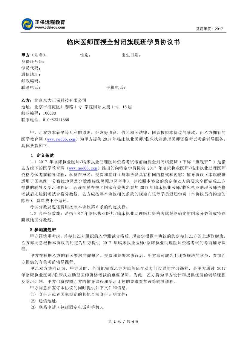 临床医师“面授全封闭旗舰班”协议书