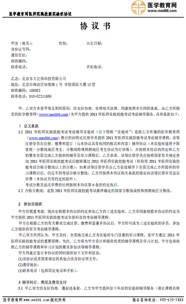 医师实践技能“实验班”协议书