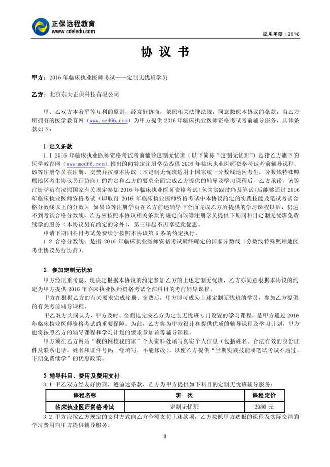 临床执业医师“定制无忧班”协议书