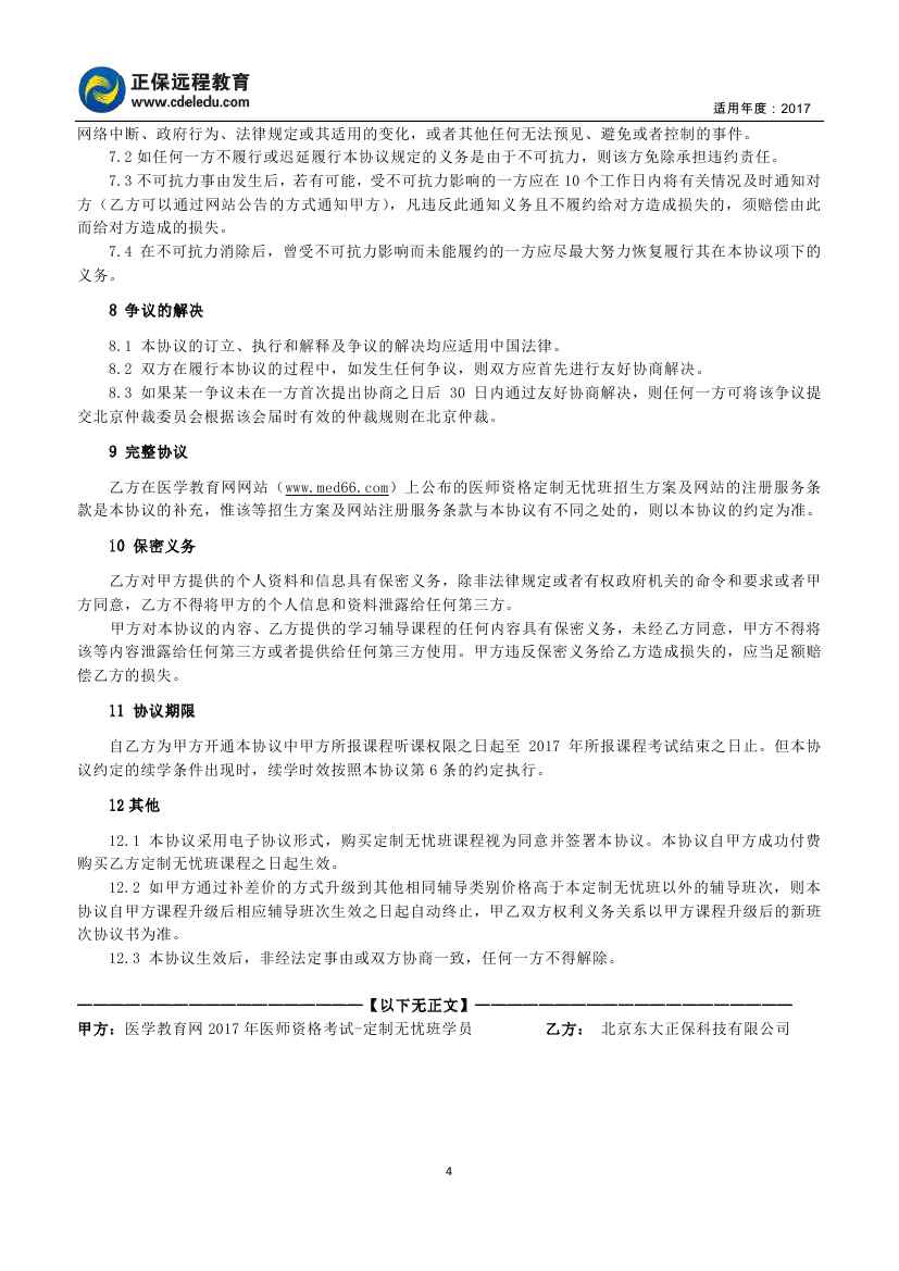 2017年医师资格“定制无忧班”协议书