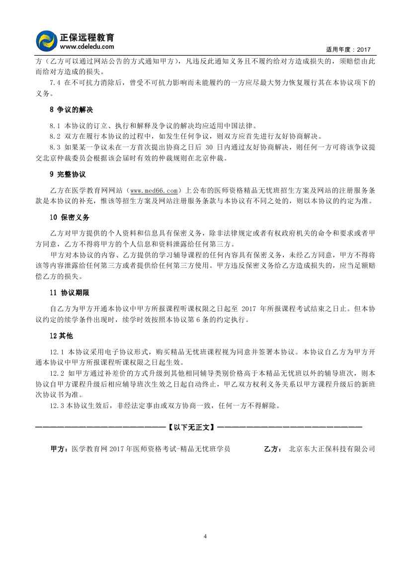 2017年医师资格“精品无忧班”协议书