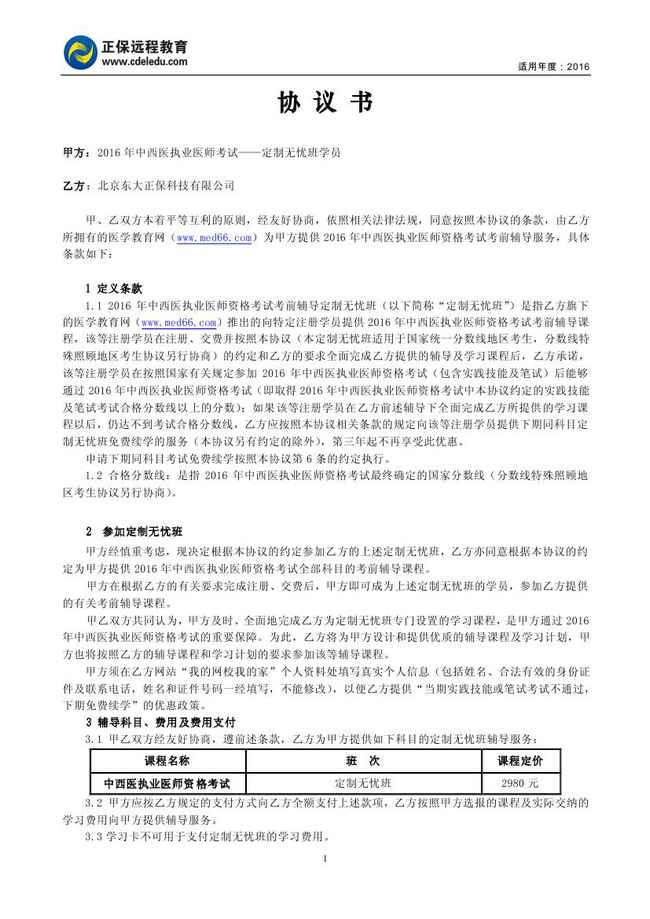 中西医结合执业医师“定制无忧班”协议书