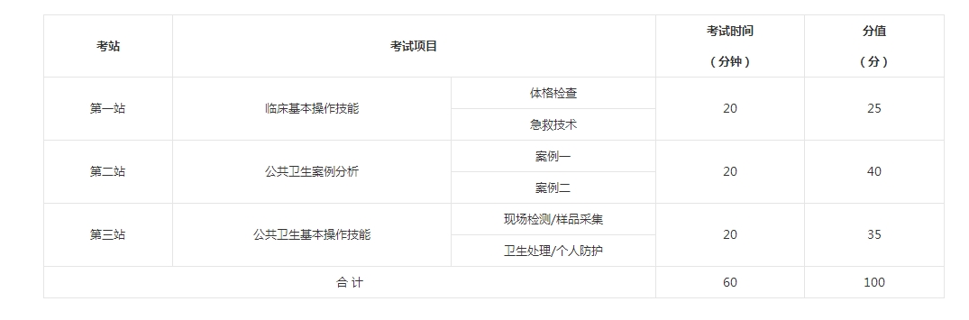 考试采用三站式考试方式,测试时间共60分钟,均采用随机抽取试题的应试方法。各站分数与考试时间如下: