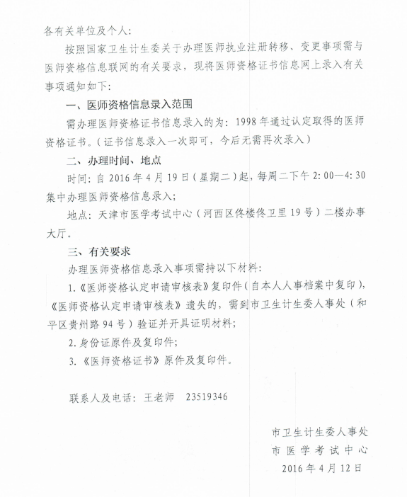医学教育网整理了关于天津市办理2016年办理医师资格信息录入有关事项的通知,具体如下: