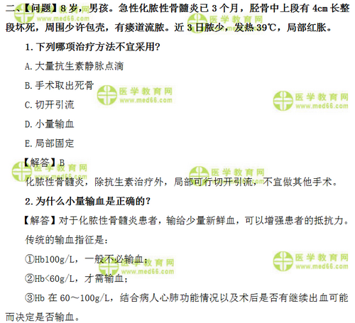 二、【问题】8岁,男孩。急性化脓性骨髓炎已3个月,胫骨中上段有4cm长整段坏死,周围少许包壳,有瘘道流脓。近3日脓少,发热39℃,局部红胀。下列哪项治疗方法不宜采用?为什么小量输血是正确的?