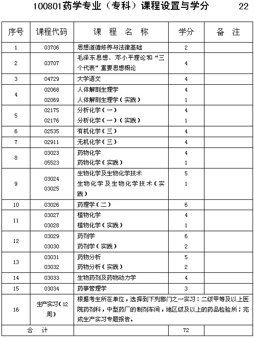 重庆市高中毕业自考药学专科课程设置与学分: