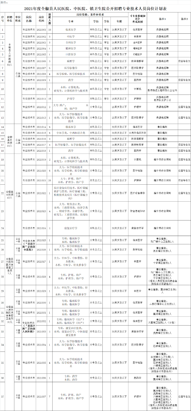 附:2021年度全椒县人民医院、中医院、镇卫生院公开招聘专业技术人员岗位计划表