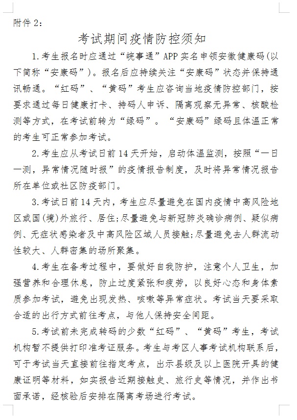 报考人员报名前,应通过“皖事通”APP实名申领“安康码”。报考人员报考前请认真阅读《考试期间疫情防控须知》(附件2)。报考人员提供的信息必须与本人实际情况、报考条件和所报考的岗位要求相一致。凡弄虚作假通过资格审查,其实际情况与报考条件规定不符的,一经查实,即取消考试、聘用等资格。
