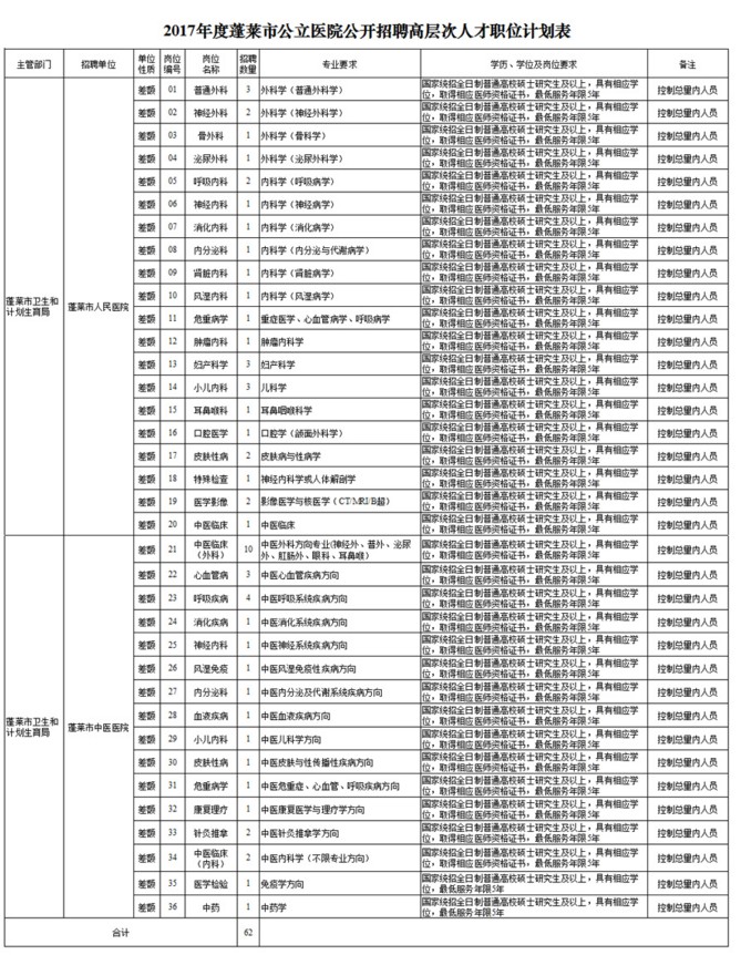 2017年山东省蓬莱市公立医院向社会招聘专业人士,要求应聘人员学历证书所载专业应当与招聘岗位专业要求相一致,并取得相应的学位,招聘考试采取笔试和面试相结合的方式,笔试成绩、面试成绩、考试总成绩均采用百分制计算,保留到小数点后两位数,尾数四舍五入。有意愿者可以详细阅读下面招聘信息!