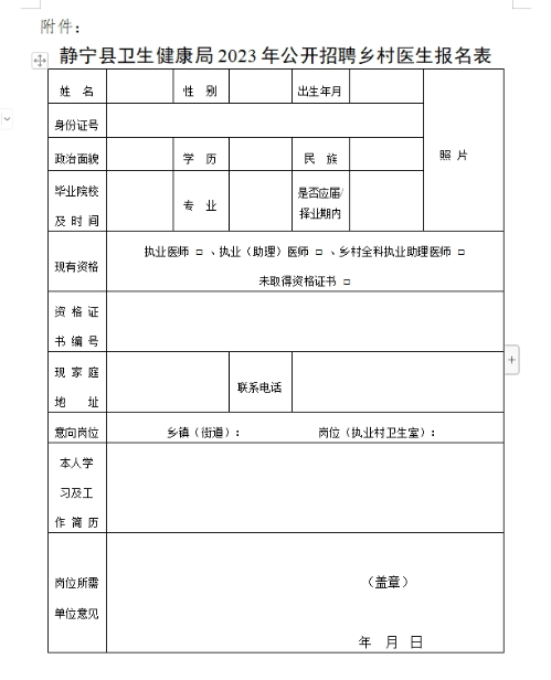 附件:静宁县卫生健康局2023年公开招聘乡村医生报名表