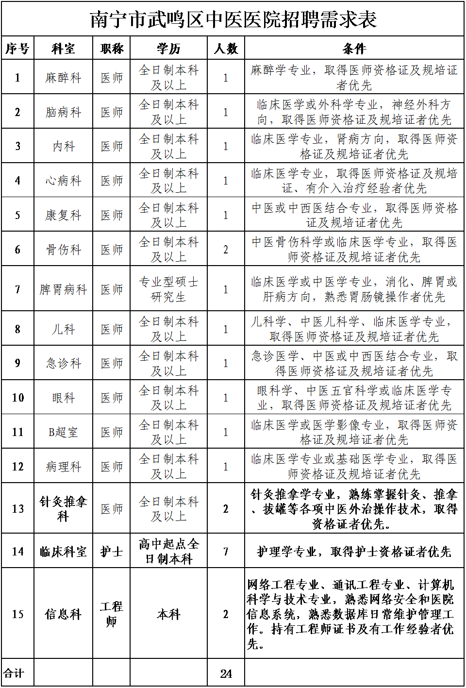 您是即将步入医疗行业的相关从业者吗?您还在为在哪里能够看到医疗岗位招聘信息而烦恼吗?您还在担心看不到所在地区全面的医疗招聘公告信息吗?以下就是新鲜的公告通知:南宁市武鸣区中医医院招医生15名,欢迎查看。