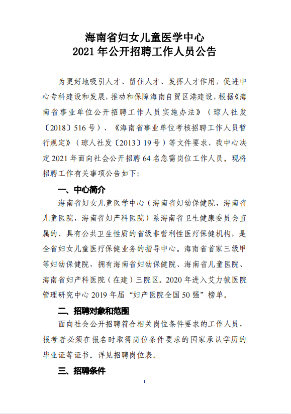 以上“招聘64人!海南省妇女儿童医学中心2021年公开招聘工作人员公告”的相关内容由医学教育网整理!了解更多医疗招聘信息,请点击医学教育网!