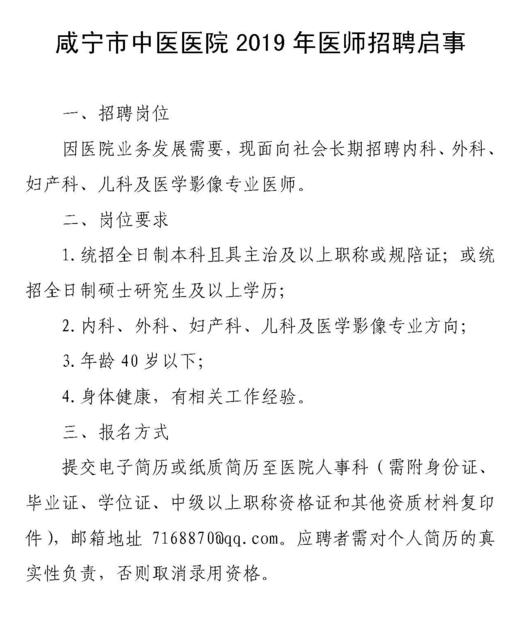 “咸宁市中医医院2019年医师招聘启事(长期有效)”由医学教育网小编为您整理,更多招聘信息请关注医学教育网医疗卫生招聘栏目!