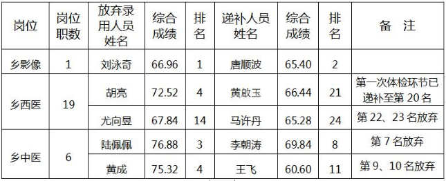 根据《事业单位公开招聘人员暂行规定》(原人事部令第6号)文件要求,2019年宜昌市夷陵区卫生健康局所属事业单位专项公开招聘经资格审查、笔试、面试、体检及考核、公示、分配到岗等程序,42名岗位职数中有5人放弃录用资格,根据招考公告依次按程序拟递补聘用5名同志,现予以公示,公示期限为2019年9月30日至2019年10月14日(7个工作日)。公示期内,对拟聘人员有异议者,请及时向夷陵区委组织部(0717-7712380)、区人社局(0717-7816063)或区卫健局(0717-7837728)反映,逾期不予受理。