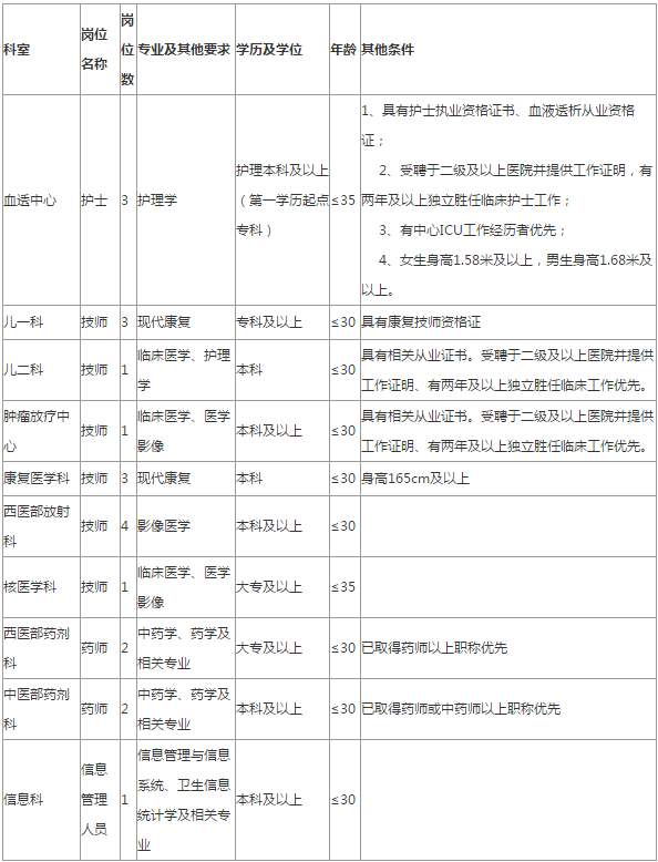 为了加强本院专业技术人才队伍建设,适应医院快速发展的需要,决定面向社会招聘工作人员21名,现公告如下: