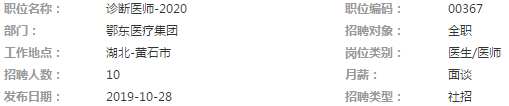 以上就是小编为大家整理的湖北黄石市中心医院招聘诊断医师10人,请大家多多关注医学教育网,我们会随时更新更多更好的关于医学知识、医疗招聘及考试辅导等相关内容,敬请期待!