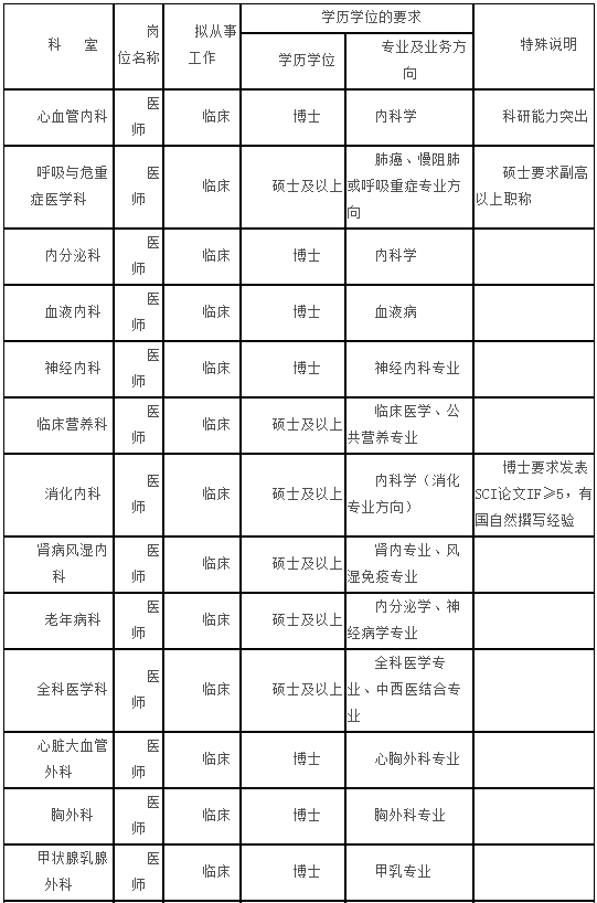 4、临床技能型紧缺人才:根据科室需求及实际工作需要,对于有特殊专长且临床科室急需的技能型人才,可适当放宽录用条件。