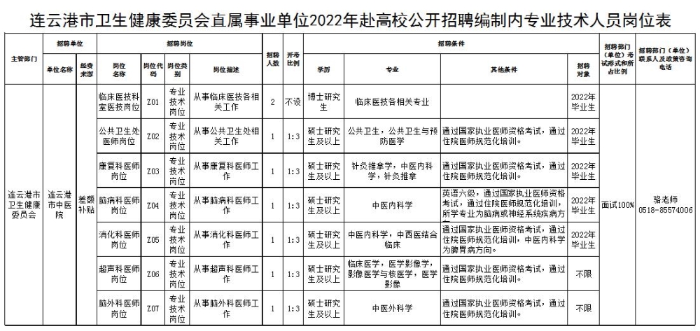 《岗位表》详见下图(可点击放大预览),《岗位表》也可在连云港市人力资源和社会保障网()、连云港市卫生健康委员会网站()查询、下载。