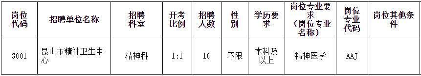 具体招聘岗位及条件等详见《昆山市精神卫生中心赴哈尔滨医科大学公开招聘2020届精神医学紧缺专业毕业生岗位简介表》。《岗位简介表》在中国昆山(卫健委信息公开专版)?status=1&bureauId=56下载。