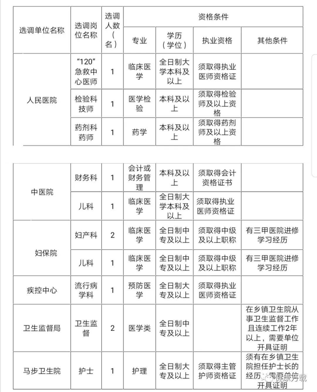 为深化事业单位人事制度改革,优化资源配置,加强人才队伍建设,促进人才合理有序流动,经县委、县政府研究同意,决定从乡镇(街道)卫生院选调一批工作人员到县人民医院、县中医院、县妇保院、县疾控中心、县卫监局和马步卫生院工作,现将选调工作方案公告如下: