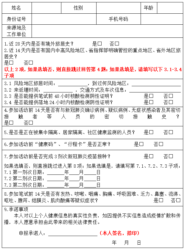 1.考生按照工作人员的引导,持本人身份证、笔试准考证,凭健康码绿码、通信大数据行程卡绿码并测量体温正常后有序进入笔试考场。所有考生须同时提供十堰市内具有核酸检测资质医疗卫生机构出具的笔试前48小时内(4月22日14:00起算)核酸检测阴性证明(为提高入场效率,请提前打印)和手写签名的《个人健康状况申报承诺书》(承诺书笔试时由监考人员统一收回)。