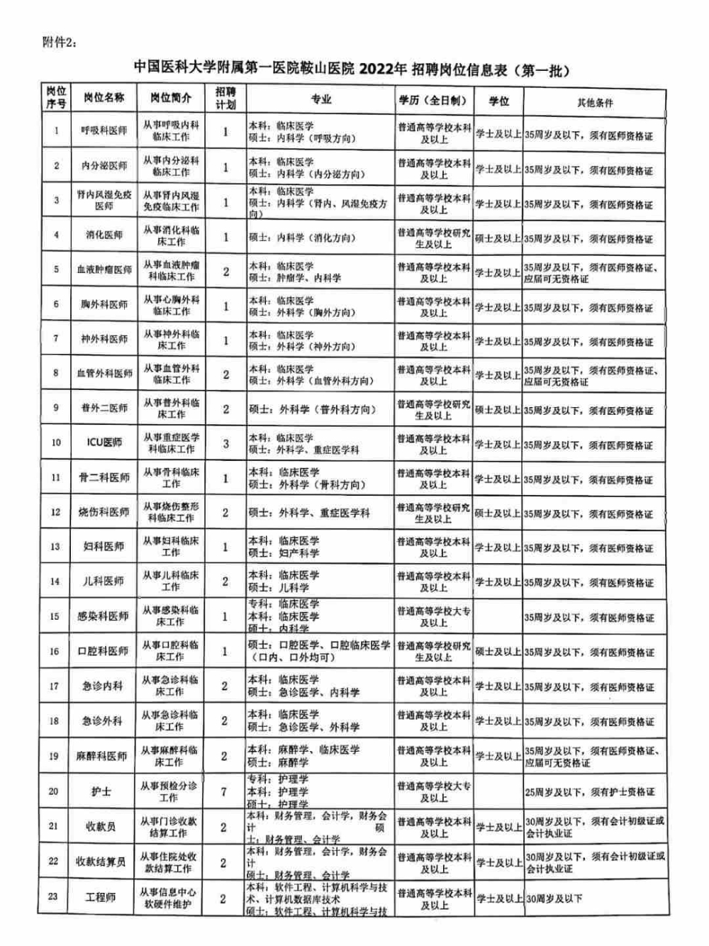 根据省、市相关文件规定,结合我院学科建设发展需要,本着“因需设岗、精简高效、公开、公正、公平竞争、择优录取”的工作思路,我院拟面向社会公开招聘合同制工作人员,具体实施方案如下:符合报考基本条件和招聘岗位具体资格条件的2022年应届毕业生及社会在职、非在职人员均可报名应聘。(三)应聘者年龄:根据岗位的具体条件,35周岁及以下(1986年3月1日(含)以后出生);30周岁及以下(1991年3月1日(含)以后出生);25周岁及以下(1996年 3月1日(含)以后出生)。(四)具备岗位所需的专业或技能条件,适应岗位要求的身体条件;(五)2022年应届毕业生可先行报名、笔试、面试、体检、考核、公示。应届生须于2022年12月31日之前取得毕业证书、学位证书、岗位要求的资格证书或考试合格成绩单,否则不予录用;(六)岗位所需要的其他条件,详见《中国医科大学附属第一医院鞍山医院2022年公开招聘工作人员岗位信息表》;曾因犯罪受过各类刑事处罚,有犯罪嫌疑尚未查清或正在接受纪律审查的,国家法律法规规定不得聘用的其他人员,均不得报考。在中国医科大学附属第一医院鞍山医院官网、微信公众号上发布招聘公告。采取现场报名的方式,不受理他人代理报名,不收取费用。报名时间:2022年3月14日至2022年3月18日(上午8:30-11:00;下午1:30-3:00)。报名地点:中国医科大学附属第一医院鞍山医院住院部四楼教室(鞍山市铁西区民主街166号1号楼,进大厅右侧楼梯直接上四楼。注意:报名者持学信网学历(学籍)证明可进入住院大楼,家长不允许陪同)联系电话:0412-6725358。根据招聘岗位要求,报考人员需携带个人简历、近期免冠彩色二寸照片三张、身份证、毕业证、学位证、资格证和执业证等相关证明原件和复印件(2022年应届毕业生提交学信网学籍在线证明)及学信网学历相关证明。报名实行诚信承诺制度,报名者填报的信息应真实有效,如发现材料虚假者,招聘期及入职后随时取消其应聘资格。如招聘岗位无执业资格证(如执业医师资格证)要求的,入职两年内(连续两次机会)必须取得相应执业资格证,未如期取得执业资格证的自动解除与其建立的聘用关系。已参加工作的考生需自行解决与原工作单位人事劳动关系问题,出现纠纷由考生自负。内容:包括相关专业知识和基础知识,笔试成绩满分为100分,考试当天在中国医科大学附属第一医院鞍山医院公示栏内公示成绩;笔试时间、地点详见《准考证》。本次招聘笔试开考比例为1:2。对招聘岗位未达到笔试开考比例的,将调整或取消该岗位招聘计划,调整或取消的岗位将在中国医科大学附属第一医院鞍山医院网站公布,报考已取消岗位的考生,未按规定时间改报的,视为放弃报考。确为急需紧缺专业或疫情防控急需上岗岗位的,经研究确定,可按实际报名人数参加面试考试。面试成绩满分为100分,合格分数线为60分,未达到合格分数线的不予聘用。面试主要考察应聘人员适应实际工作岗位要求的综合素质,按招聘计划1:2的比例,依照笔试成绩从高分到低分的排序进入面试环节,最后一名成绩并列者同时入选,如个人原因放弃面试者,按笔试成绩排名从高到低依次等额递补面试人选。根据总成绩,按招聘计划1:1的比例确定体检人选。总成绩并列者,按面试成绩由高到低的排序,确定体检人选,因体检不合格或其他原因造成岗位空缺者,按总成绩排名从高到低依次等额递补体检人选。对于体检不合格的,不予聘用;对于在体检过程中,弄虚作假或隐瞒真实情况的报考者,不予聘用或取消聘用。因体检不合格、本人放弃体检资格等原因可递补一次。重点对应聘人员思想政治表现、道德品质等情况进行考核并对被考核人员资格条件进行复查。考核中发现有不符合聘用条件的,将取消聘用资格,并将结论及依据明确告知被考核人员。考核合格者,确定为拟聘用人员。因考核不合格、本人放弃考核资格等原因可递补一次。拟聘用人选确定后,在中国医科大学附属第一医院鞍山医院公示栏内公示,公示期为7日。公示结束后,对公示无异议人员办理备案手续。公开招聘的人员按规定实行试用期制度,试用期为两个月(研究生及以上学历者为一个月)。试用期包括在聘用合同期限内。试用期满合格者,予以正式聘用,签订固定期限劳动合同;不合格的,取消聘用。1、试用期执行见习期工资标准,试用期满合格后工资、福利待遇比照国家卫生事业单位执行,缴纳五险一金;2、依据《鞍山市解决引进人才住房实施细则(试行)》文件精神,符合规定条件的人员,可享受住房补贴或租住人才公寓,医院可协助办理相关手续。本次招聘工作坚持德才兼备和公开、公平、公正、择优的原则,严肃纪律,秉公办事,严禁弄虚作假,徇私舞弊,全程接受纪检监察部门和社会的监督。报考者有弄虚作假、违纪违规行为的,一经发现,均取消其应聘资格,如果已经聘用的,将解除聘用关系,并将有关情况通报其所在学校或单位。构成犯罪的,依法追究刑事责任。凡参加本次招聘考生,必须严格遵守有关疫情防控要求,履行个人责任,如实报告健康信息,对瞒报、谎报、不履行个人责任造成严重后果的,追究法律责任,并取消考试资格。考生必须严格执行疫情防控要求,按照考试各环节安排,如实报备个人行程码、健康码、所在地及个人健康状况等信息。对来自中高风险地区人员应提前做好14天隔离并持7日内核酸检
