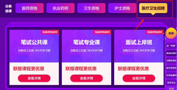 (1)点击“医疗卫生招聘”进行优惠选课,满300-30元,上不封顶!
