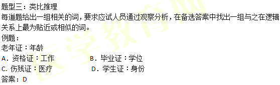 主要测查应试人员对各种事物关系的分析推理能力,涉及对图形、语词概念、事物关系和文字材料的理解、比较、组合、演绎和归纳等。常见的题型有:图形推理、定义判断、类比推理、逻辑判断等。