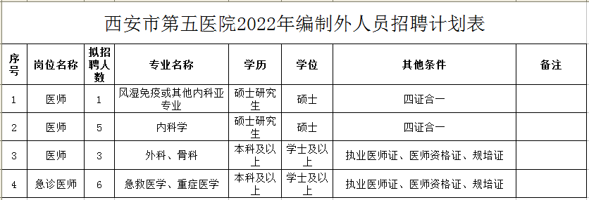 见附件(西安市第五医院2022年编制外聘用人员招聘计划表)