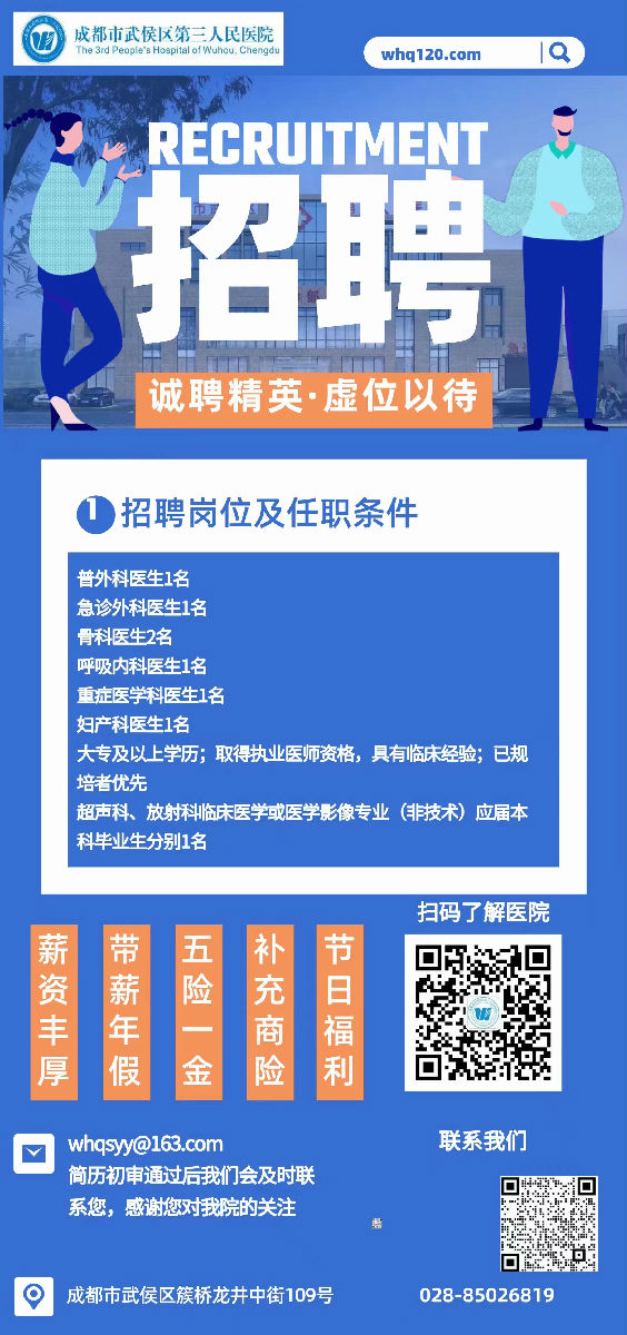很多即将步入医疗岗位的朋友们都非常关注所在地区医疗岗位的招聘公告信息,医学教育网医疗卫生招聘栏目为了更好的服务正在找工作的医疗相关专业人员,每天为大家整理搜集新鲜的各地医疗卫生系统/医院等招聘公告通知和信息,欢迎大家查看!以下是公告通知:成都市武侯区第三人民医院招聘医生9人,内容如下: