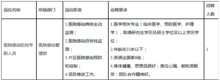 因工作需要,我院医院感染管理部现面向社会公开招聘1名医院感染防控专职人员:
