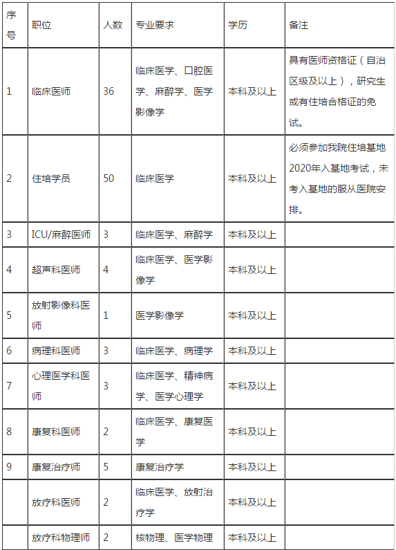 随着江苏省属8家三甲医院和4所医学高校援疆工作的持续深入,进一步实施“人才强院”的发展战略,按照自治区党委组织部等六部委《关于进一步加强医疗人才“组团式”受援医院领导班子建设的意见》(新党组通字〔2018〕69号)文件精神,我院计划2020年内地公开招聘应往届大学毕业生180名。