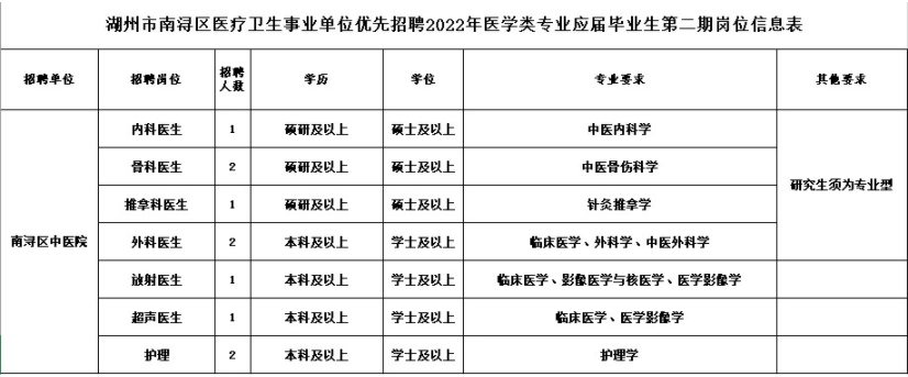 很多即将步入医疗岗位的朋友们都非常关注所在地区医疗岗位的招聘公告信息,医学教育网医疗卫生招聘栏目为了更好的服务正在找工作的医疗相关专业人员,每天为大家整理搜集新鲜的各地医疗卫生系统/医院等招聘公告通知和信息,欢迎大家查看!以下是公告通知:2022年浙江省湖州市南浔区中医院招聘10人公告,内容如下: