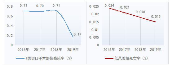 2.医疗技术能力不断增强,医疗质量、安全与效率同步提升。2019年,全国三级公立医院DRG组数中位数较上年增加27组,诊疗病种覆盖面逐年增加,医疗服务广度进一步提升明显。陕西、甘肃和青海的病例组和指数(CMI值)均较上年增加0.03以上。三级公立医院手术患者I类切口感染率、低风险组病例死亡率中位数较上年下降(见图5)。大型仪器设备检查阳性率85.36%,较上年上升2.1个百分点,影像诊断与临床诊断的符合率稳步提升,三级公立医院医疗质量和安全管理情况持续向好。