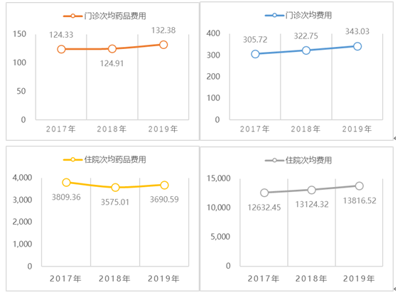 二是医药费用增幅趋于平稳。2019年,三级医院门诊次均费用增幅和住院次均费用增幅分别为6.28%和5.27%,门诊次均药品费用增幅和住院次均药品费用增幅分别为5.98%、3.23%,总体增幅水平合理(见图8)。