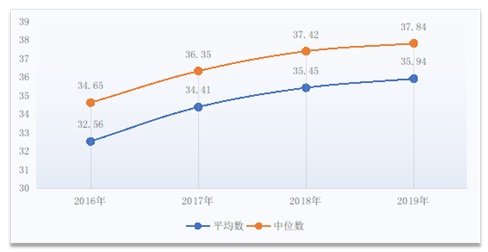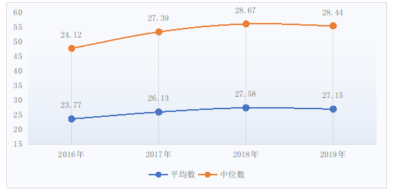 图12 2016-2019年医疗服务收入(不含药品、耗材、检查检验收入)占医疗收入比例(%)
