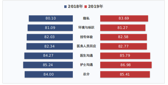 5.患者满意度稳定在较高水平。2019年,全国三级公立医院门诊和住院患者满意度分别为85.41分、91.01分,同比提升1.41分和1.01分。其中,门诊患者满意度最高的5个省份依次为浙江省、湖南省、福建省、山东省和四川省;住院患者满意度最高的5个省份依次为浙江省、江苏省、福建省、山东省和湖南省。门诊患者对护士沟通、医生沟通满意度普遍较高,对挂号体验、环境与标识、医务人员回应的满意度偏低。住院患者对医务人员对患者家属态度、医务人员回应性和医生沟通的满意度较高,对疼痛管理、出入院信息及手续、饭菜的满意度偏低。相比之下,门诊患者对于隐私保护、住院患者对于医生沟通的满意度提升最快(见图13-14)。