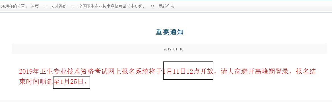 2019年卫生专业技术资格考试报名入口于1月10开放后,因系统维护暂停使用。现医学教育网小编从中国卫生人才网获悉,2019年卫生资格考试入口将于1月11日12点开放,报名时间延长至1月25日。