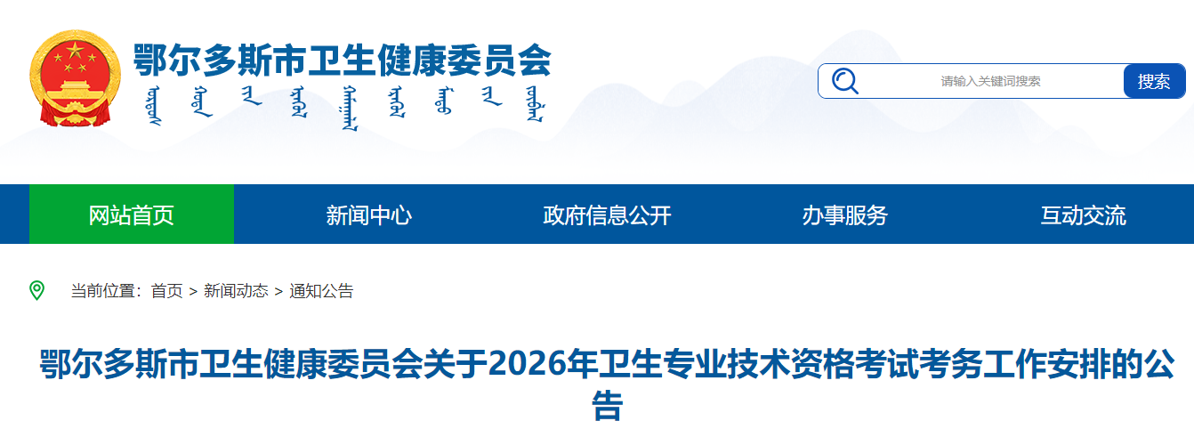 2026年度全国卫生专业技术资格考试定于4月11、12、18、19、25、26日举行。根据《内蒙古考区关于2026年度卫生专业技术资格考试考务工作安排的通知》(内卫医教考发〔2025〕160号)文件要求,现将鄂尔多斯考点有关事项公告如下。