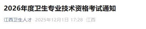 根据《卫生专业技术资格考试办公室关于2026年度卫生专业技术资格考试有关问题的通知》(卫考办发〔2025〕1号)和《国家卫生健康委人才交流服务中心关于2026年度卫生专业技术资格考试考务工作安排的通知》(卫人才发〔2025〕74号),现将我省2026年度卫生专业技术资格考试工作有关事项通知如下: