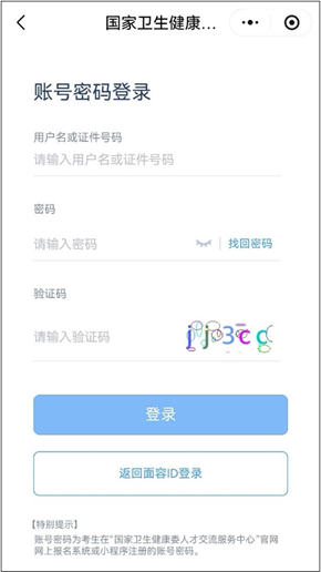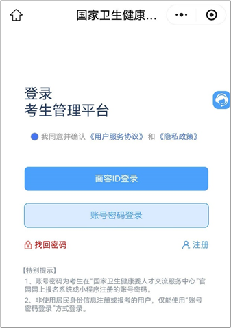 打开百度、微信或支付宝客户端,搜索“国家卫生健康委人才交流服务中心”小程序,进入考生管理平台登录界面。
