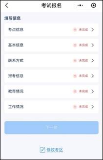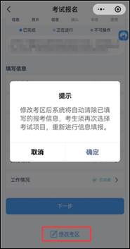 3.如信息填写后发现省份选择有误,请在“未提交报名信息”状态下,使用【修改考区】功能进行修改。修改考区操作将会清空此项目下已经填写的报名信息,但不影响注册信息和基本信息。