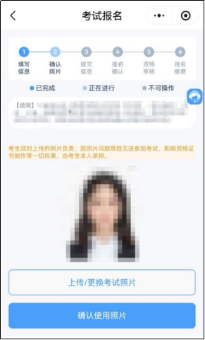 5.报名信息填写完成后进入“确认照片”页面。如没有显示照片或需要更换照片,请点击“上传/更换考试照片”,上传符合要求的照片;如使用显示的照片,点击“确认使用照片”。