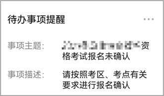 请考生注意查看微信推送的“待办事项提醒”通知,未自动确认的务必按照所在考区、考点要求进行报名确认,未按时完成报名确认的视为主动放弃考试。