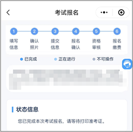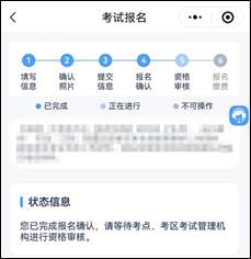 提交报名信息后,考生须按照当地考试管理机构的要求,在规定的时间内,携带报名表和相关材料到指定地点进行报名确认。经报名点或考点确认后,【报名确认】节点变为深蓝色,同时【资格审核】节点变为浅蓝色。