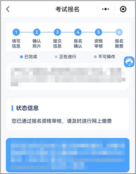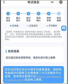 未开通网上缴费的考区,【资格审核】节点变为深蓝色即表示报名成功。