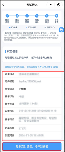 点击报考流程中的【报名缴费】节点,核对报考专业科目和金额,确认无误后按系统提示进行缴费。