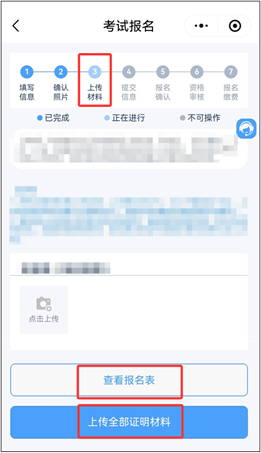 填写信息完成后,系统将跳转至【上传材料】节点,进入上传材料页面。考生可先点击“查看报名表”,下载并打印报名申请表,然后按照考区的要求上传相关证明材料。