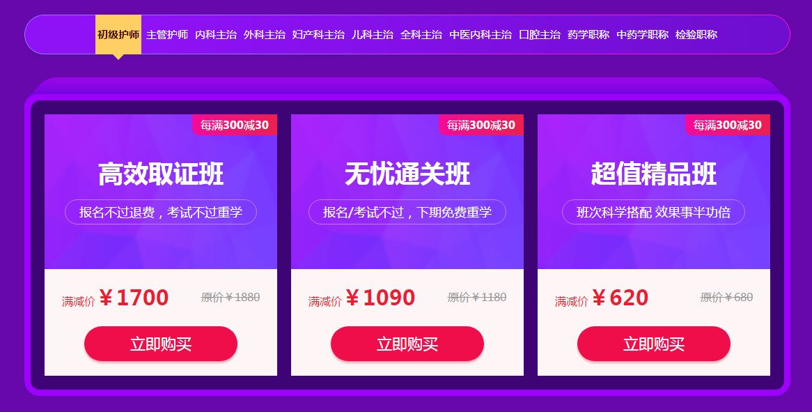 活动期间,所有卫生资格考试辅导课程,无论全套班次,还是单科辅导,均可享受每满300减30的优惠。