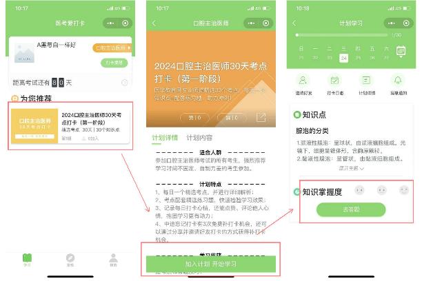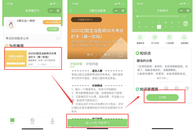 第三步:选择打卡计划,如“2025***30天考点打卡(第一阶段)”,点击下方“加入计划开始学习”,进入学习知识点并答题。